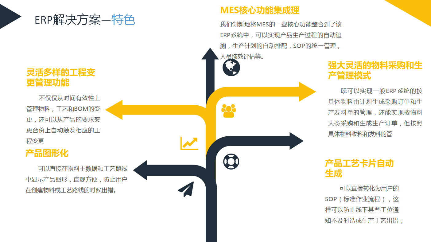 相较于其它ERP系统,该系统有以下核心亮点和优势: 1、产品图形化,可以直接在物料主数据和工艺路线中显示产品图形,直观方便,防止用户在创建物料或工艺路线的时候出错; 2、产品工艺卡片自动生成,包括图片和详细工艺流程,此功能可以直接转化为用户的SOP(标准作业流程),这样可以防止线下某些工位通知不及时造成生产工艺出错; 3、工艺路线维护灵活方便,大大节省了用户的维护成本;在维护工艺路线的时候不仅可以直观显示产品图形,还能同时显示产品的大小工序; 4、灵活多样的工程变更管理功能,不仅仅从时间有效性上管理物料,工艺和BOM的变更,还可以从产品的要求变更台份上自动触发相应的工程变更; 5、全新的BOM管理模式,在系统中不仅可以管理本公司的BOM,还包含了客户的BOM层级,这样能很好地进行客户交付物的配套管理; 6、灵活的销售价格和销售结算管理,既可以针对单个销售产品和客户管理销售价格和销售结算,也可以针对整体产品和客户进行管理; 7、强大灵活的物料采购和生产管理模式。既可以实现一般ERP系统的按具体物料由计划生成采购订单和生产发料单的管理,还能实现按物料大类采购和生成生产订单,但按照具体物料收料和发料的管理; 8、MES核心功能集成。我们创新地将MES的一些核心功能整合到了该ERP系统中,可以实现产品生产过程的自动追溯,生产计划的自动排配,SOP的统一管理,人员绩效评估等。