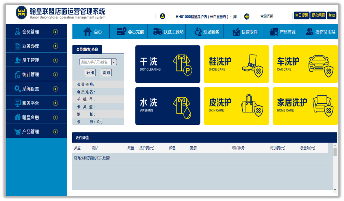 门店经营系统。其功能主要包括门店的收件、业务加工、取件及会员管理等。
